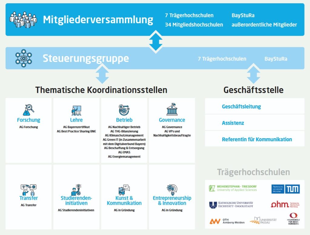 - Die Steuerungsgruppe ist in Abstimmung mit der Geschäftsstelle für alle Entscheidungen zuständig, die nicht der Mitgliederversammlung vorbehalten sind, und steuert damit die Aktivitäten von BayZeN.